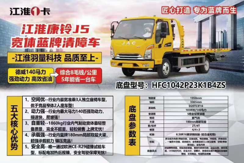 江淮J5清障車,2噸上裝,4噸卷揚,20米鋼絲繩,有三種板面可選,一體板3.8+1.3=5.1米左右,寬2.3米,雙側聯動操作,配警燈喊話器一5套.輔助小車一套,四根捆綁帶,底盤合格證,整車合格證,